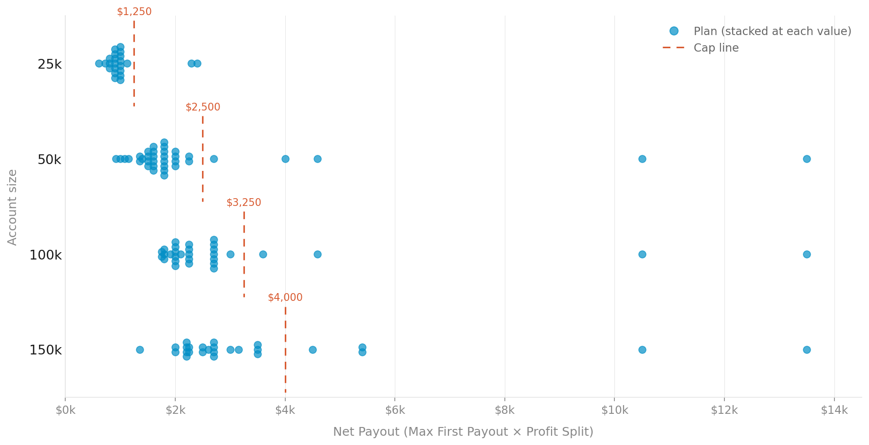 Each dot is one prop firm plan. Dots are stacked at their exact Net Payout value so you can see the clustering at a glance. The dashed line for each row marks that size's cap. Plans to the right of it are normalized down.
